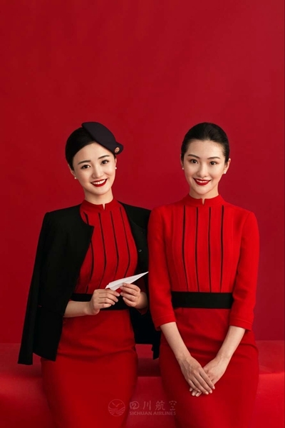 川航在空乘制服的设计一直为大众关注。早年的斑点衬衣搭配白色花边套裙曾在蓉城风行一时,引领了各行各业窗口单位的制服潮流;第六代制服“红玫瑰”与“蓝宝石”,腰部以蝴蝶结点睛,自08年推出以来好评不断。不仅如此,川航也是行业内较早将旗袍设计为空乘制服的航空公司之一,向世界展示中国文化。