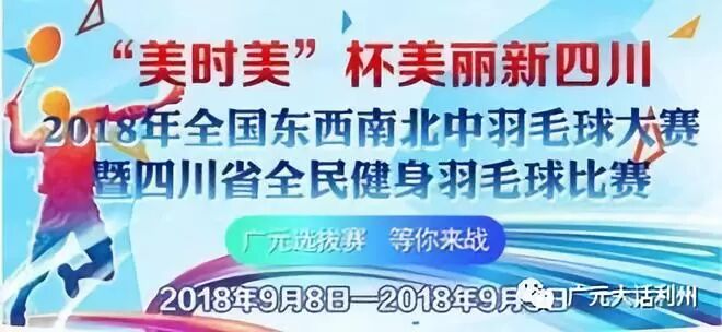 为做靓女儿节品牌,经2018中国(广元)女儿节活动筹备工作协调组全体成员会议同意,决定于2018年9月8日至9日在广元澳源体育中心体育馆举行“美时美杯”美丽新四川2018全国东西南北中羽毛球大赛暨四川省全民健身羽毛球比赛。