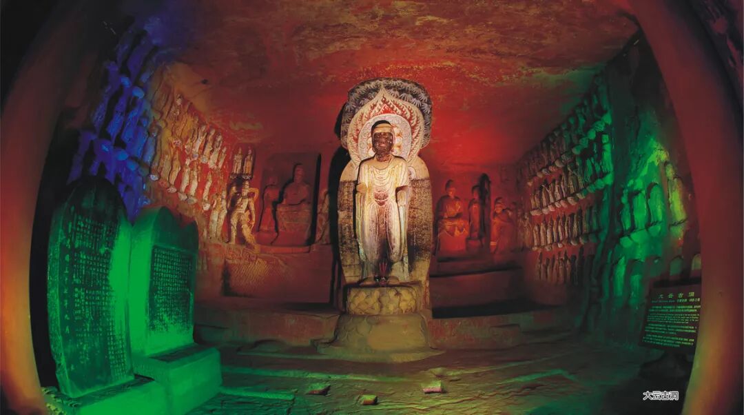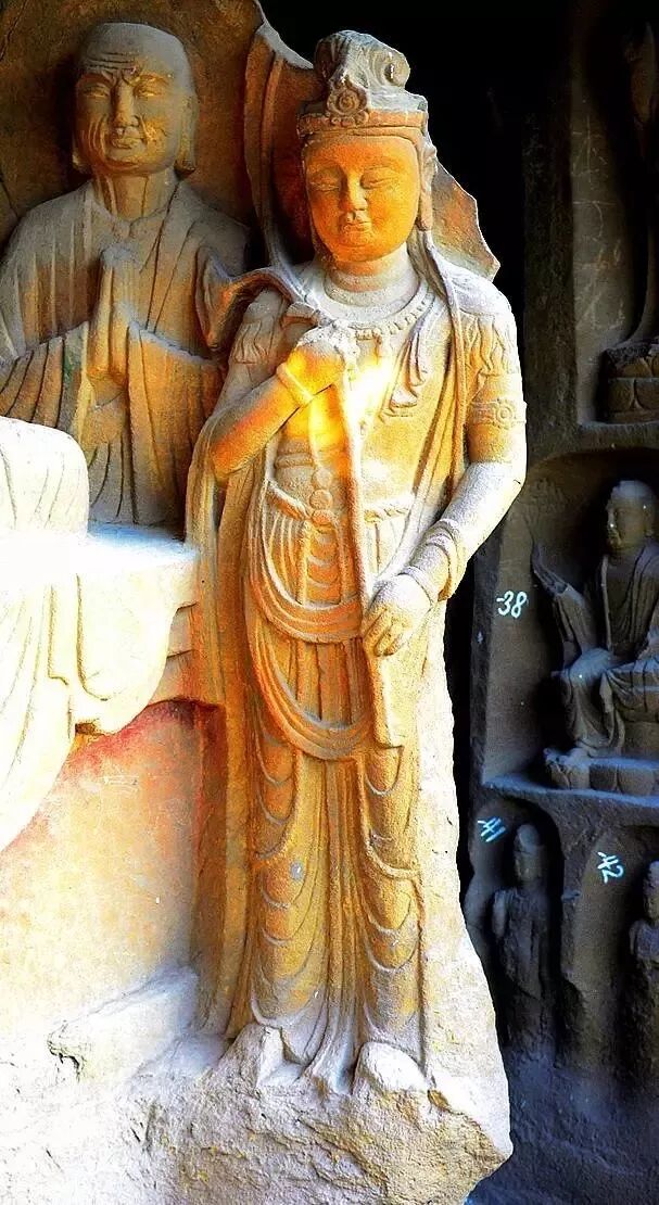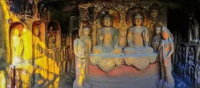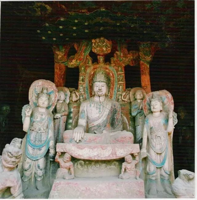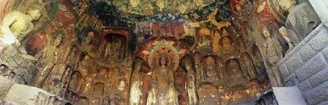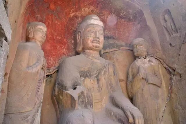 莲花洞开凿于武周时期,因窟顶浮雕双层莲花而得名。窟内三壁各开一圆形大龛,龛内各凿一佛,合称三世佛,即佛教中所说的过去佛阿弥陀佛、现在佛释迦牟尼佛、未来佛弥勒佛。