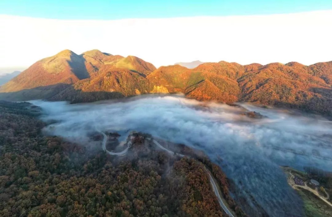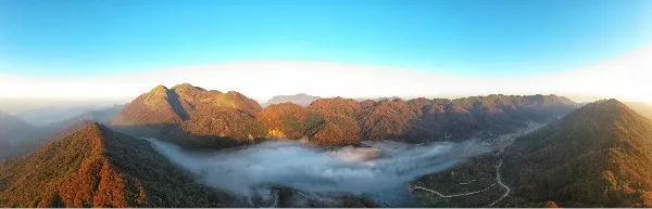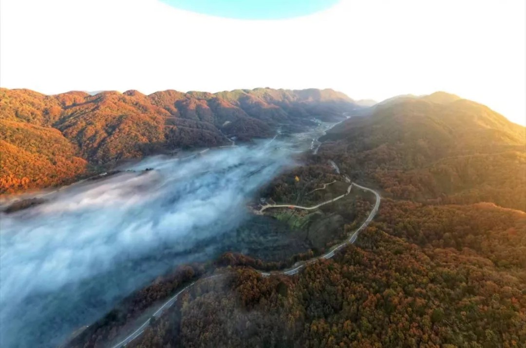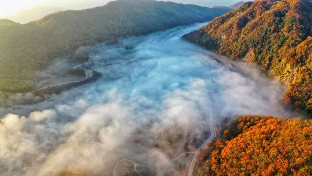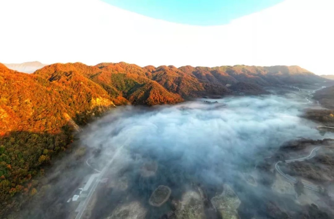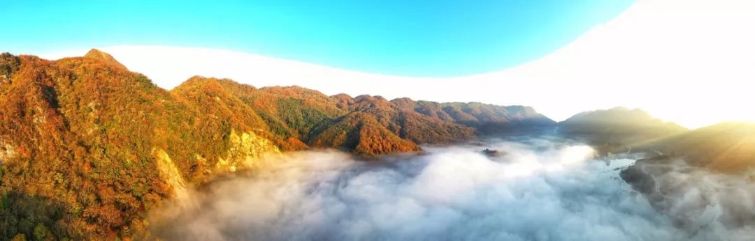 月坝的云海,就像大山的孩子,依偎在山峦之间,诉说着他对群山的依恋。当然,他偶尔也会顽皮,山谷、沟壑就是他最好的玩耍场所,漫山红叶成为他的玩伴......