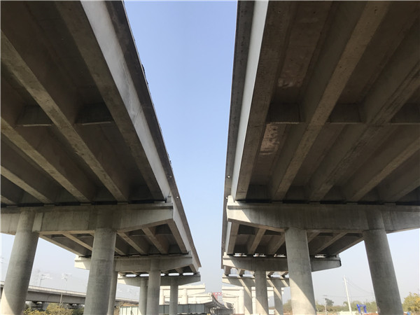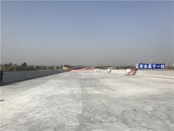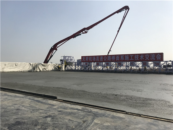 桥面铺装施工是线下施工的最后一道工序,施工完成后,天府机场高速线下施工就全部结束了。天府机场高速全长88公里,是我省首条规划的双向8车道高速公路,为确保施工质量,此次桥面铺装施工采用新型超声波桁架摊铺整平机,总宽达49.4米的桥面将一次摊铺成型,相较于使用传统工艺进行桥面分段铺设,提升了桥面混凝土平整度,施工效率。