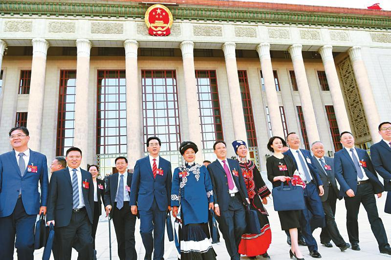 出席十三届全国人大二次会议的四川代表团代表步出人民大会堂。
