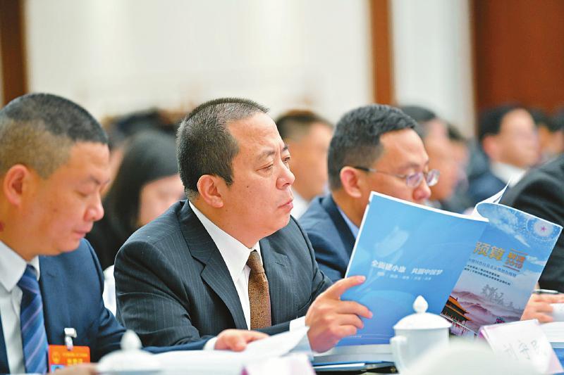 甲登·洛绒向巴代表(中)就弘扬优秀民族传统文化发言。