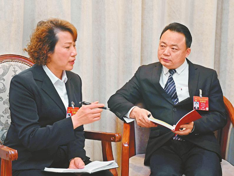 贺光玉代表(左)和罗朝运代表交流。她建议调整完善农村退耕还林有关政策。