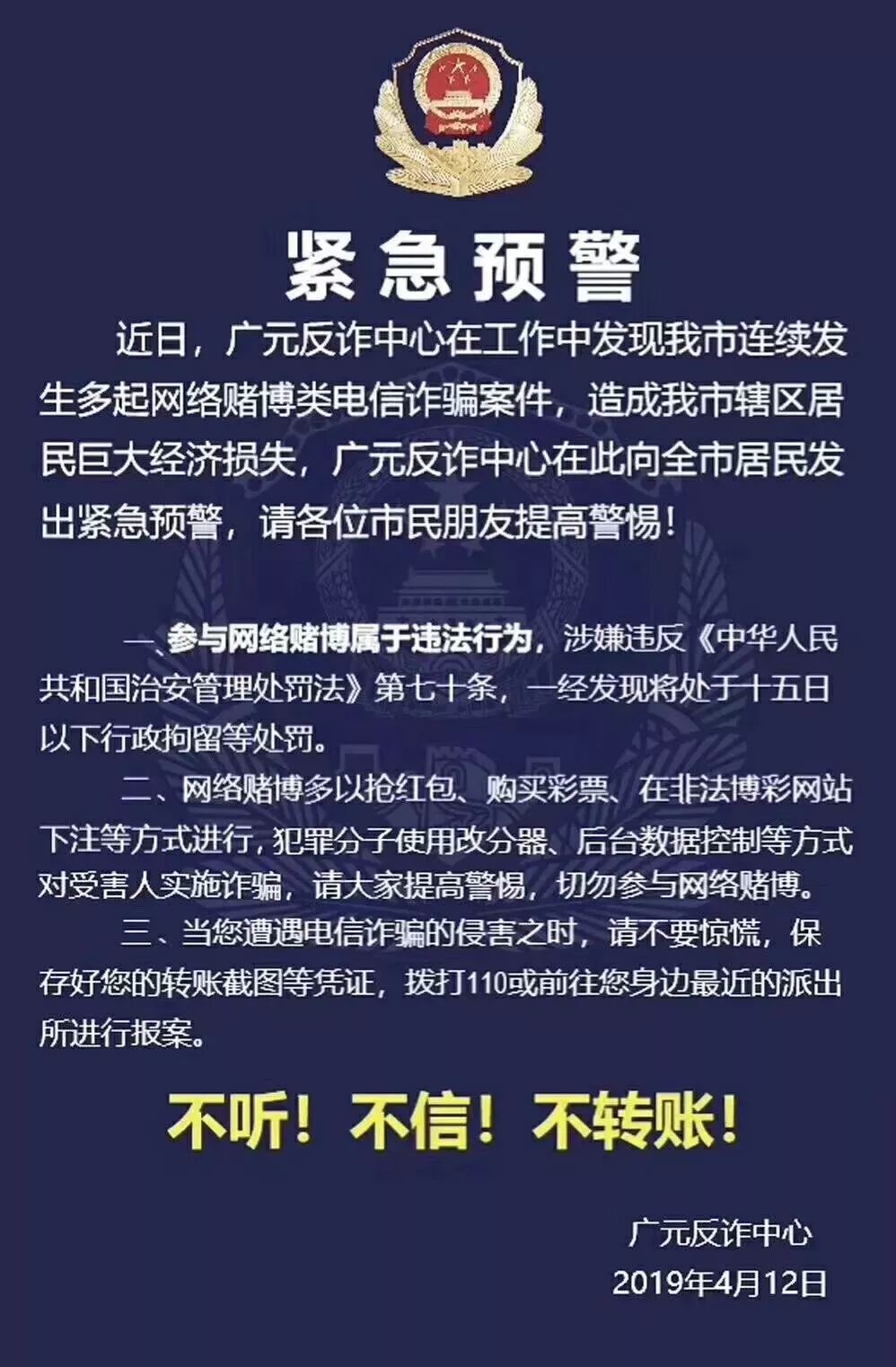 近日,广元反诈中心在工作中发现我市连续发生多起网络赌博类电信诈骗案件,造成我市辖区居民巨大经济损失,广元反诈中心在此向全市居民发出紧急预警,请各位市民朋友提高警惕!