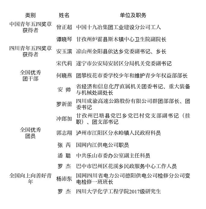 来自我省的14名青年代表也赴京参会,他们中有中国青年五四奖章获得者、四川青年五四奖章获得者、全国优秀团干部、全国优秀团员和全国向上向善好青年。(付文力)