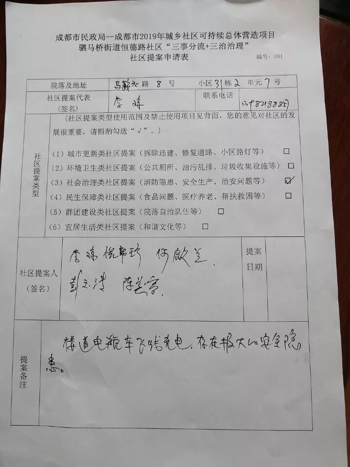 恒德路社区“三事分流、三治治理”项目启动会后,社区以“三事分流+三治治理”为突破,对于分流出的社区公共事务,搭建社区、院落(小区)提案平台。8月25日马鞍北路8号院院落代表向恒德路社区提案,反映楼道有电瓶车飞线充电,存在极大的安全隐患。