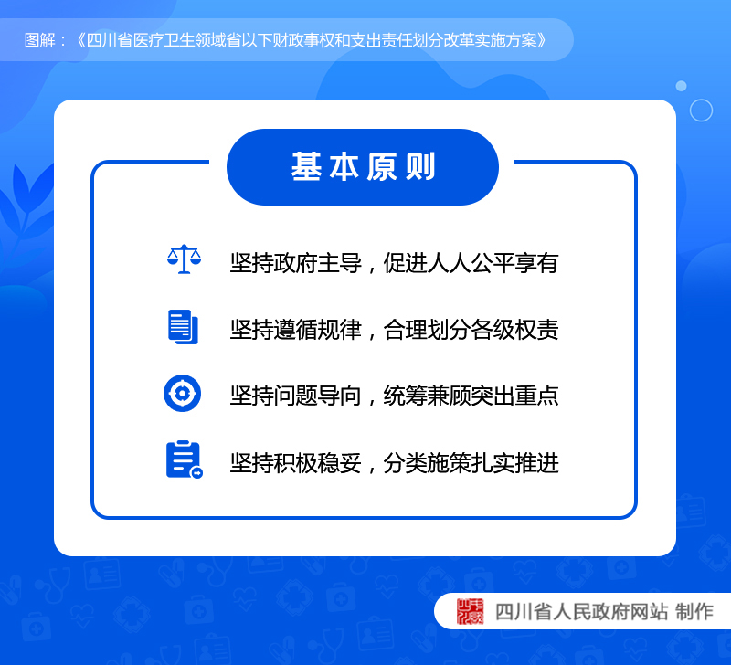 推动形成政府主导、省级统筹、重点突出、运转高效、持续发展的医疗卫生领域财政事权和支出责任划分模式,四川制定出台《省医疗卫生领域省以下财政事权和支出责任划分改革实施方案》(以下简称《实施方案》)。四川将从公共卫生、医疗保障、计划生育、能力建设四个方面,推进省以下各级财政事权和支出责任划分。