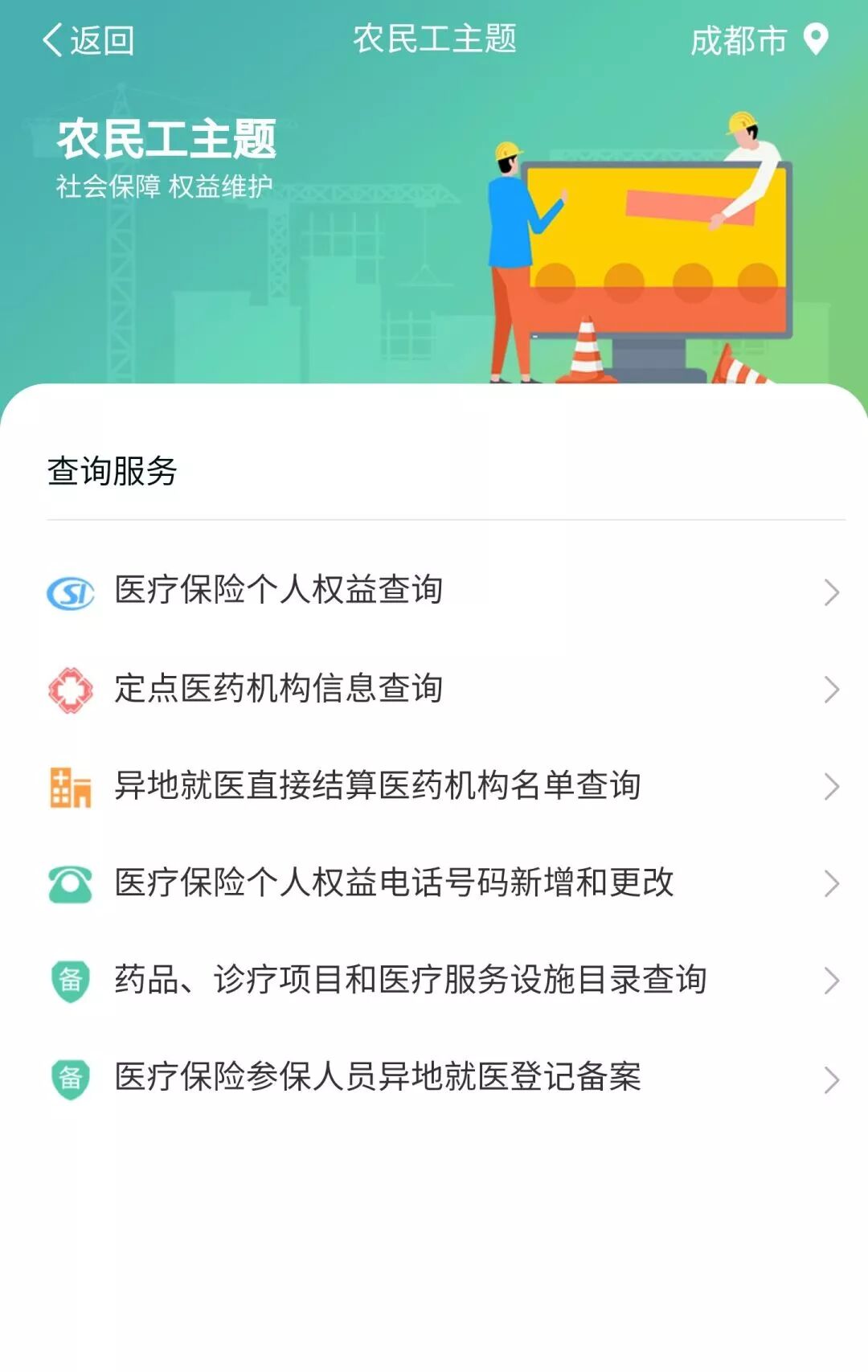 针对全省农民工,我们提供医保个人权益、定点医疗机构、药品诊疗项目目录查询。