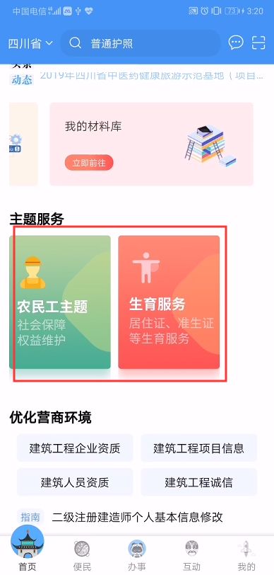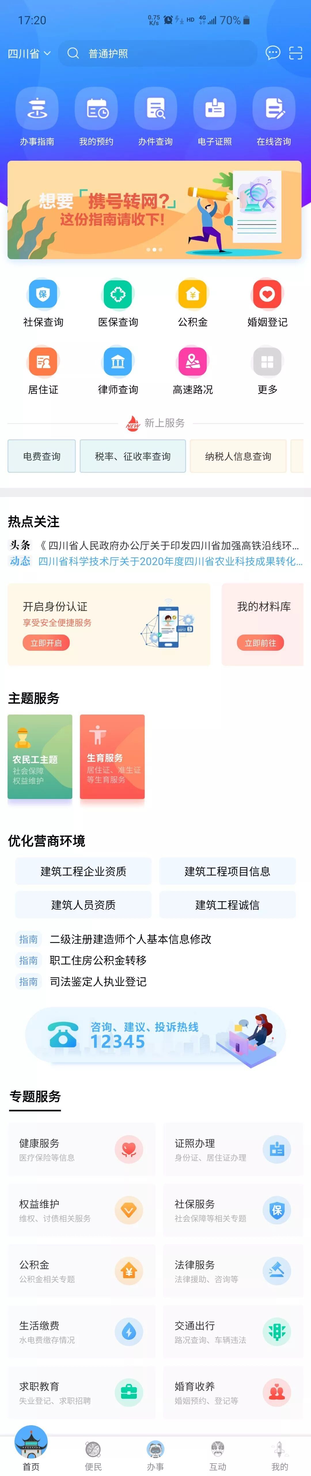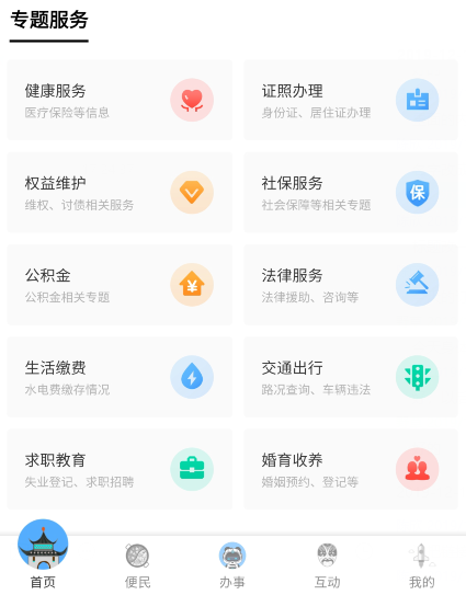 升级后的“天府通办”根据您的常用习惯,聚类便民服务,推出健康服务、证照办理、权益维护、社保服务、公积金、法律服务、生活缴费、交通出行、求职教育、婚育收养十大热门专题服务。