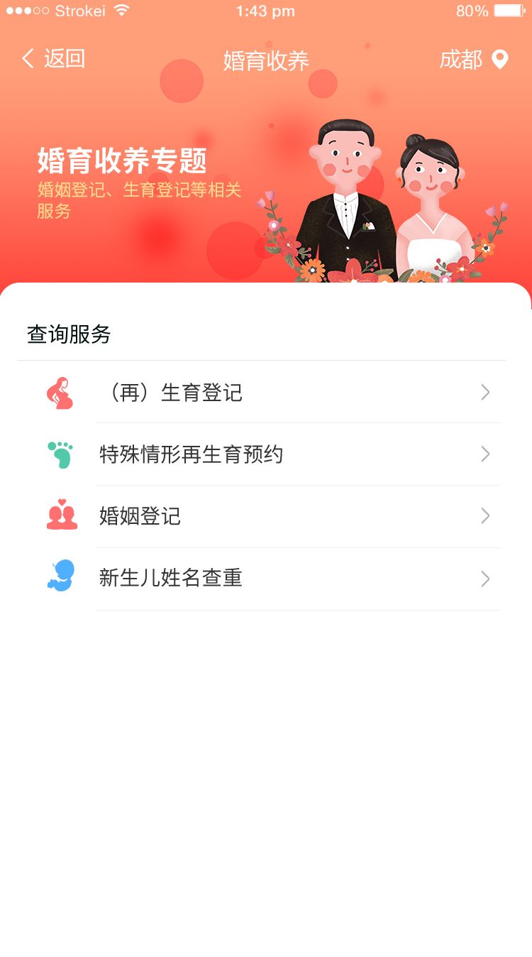 如果您家有喜事,在婚育收养专区,您可掌上进行婚姻登记、生育登记,还可对小宝宝的姓名进行全省查重。
