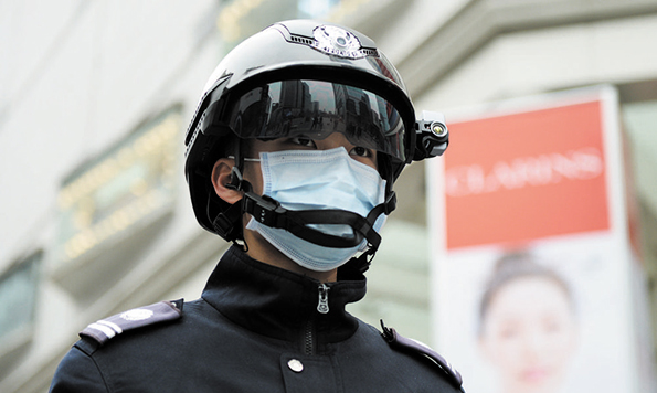 近日,一款测温智能头盔亮相成都市锦江区春熙路街头。该头盔可完成对前方3到5米范围内所有目标人员的扫描,若发现发热人员,头盔立刻声光报警,可帮助工作人员实现高效测温。图为3月5日,佩戴智能头盔的工作人员在人流量较大的春熙路步行街监测体温。来往人员的体温值会实时显示在头盔内部屏幕上。文图除署名外据新华社
