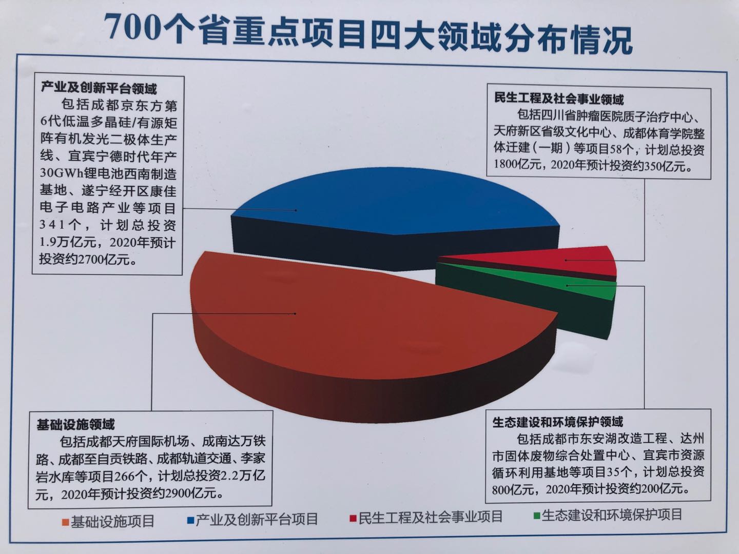 700个省重点项目主要分布在哪些领域?记者从会场了解到,主要聚焦在以下四个方面。(1)产业及创新平台领域:包括成都京东方第6代低温多晶硅/有源矩阵有机发光二极体生产线、宜宾宁德时代年产30GWh锂电池西南制造基地、遂宁经开区康佳电子电路产业等项目341个,计划总投资1.9万亿元,2020年预计投资约2700亿元;(2)基础设施领域:包括成都天府国际机场、成南达万铁路、成都至自贡铁路、成都轨道交通、李家岩水库等项目266个,计划总投资2.2万亿元,2020年预计投资2900亿元;(3)民生工程及社会事业领域,包括四川省肿瘤医院质子治疗中心、天府新区省级文化中心、成都体育学院整体搬迁(一期)等项目58个,计划总投资1800亿元,2020年预计投资约350亿元;(4)生态建设和环境保护领域,包括成都市东安湖改造工程、达州市固体废弃物综合处置中心、宜宾市资源循环利用基地等项目35个,计划总投资800亿元,2020年预计投资200亿元。