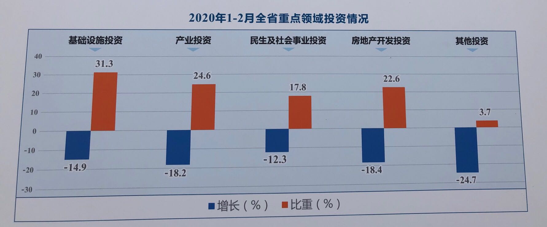 具体来看,2020年1-2月全省重点领域投资情况,基础设施投资下降14.9%,产业投资下降18.2%,民生及社会事业投资下降12.3%,房地产开发投资下降18.4%,其他投资下降24.7%。