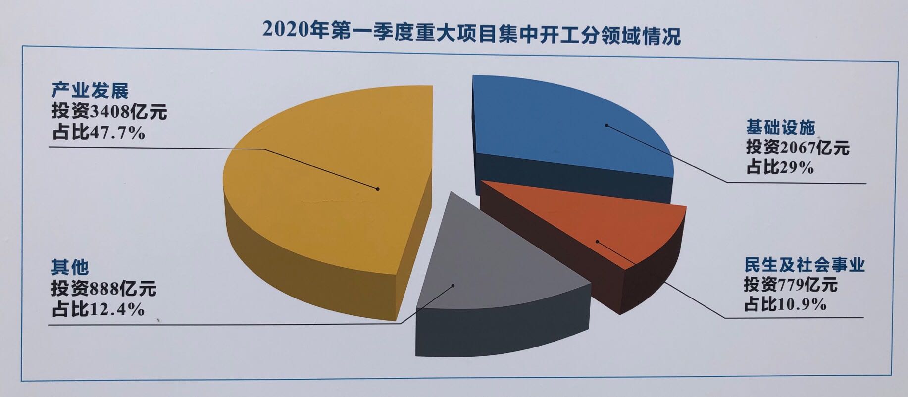 今天全省第一季度集中开工的重大项目1416个、总投资7142亿元。其中:基础设施项目395个、总投资2067亿元、占比29%,产业项目694个、总投资3408亿元、占比47.7%,民生及社会事业项目210个、总投资779亿元、占比10.9%,其他项目117个、总投资888亿元、占比12.4%。