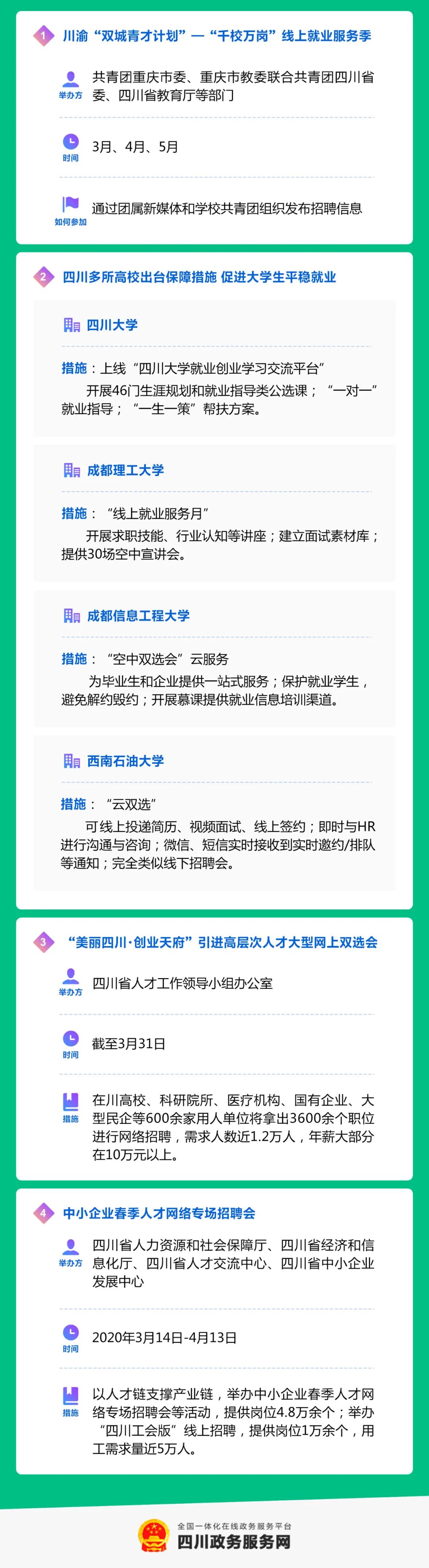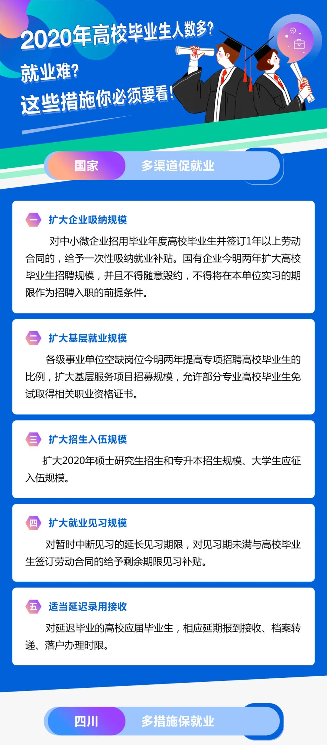 国家相关部门和四川省政府纷纷出台相应措施,扩大企业、基层就业规模,保障高校毕业生就业。“延、返、降、减、免、缓、补”一系列特殊支持政策,助企降低用工成本、减低负担、稳岗渡难关。