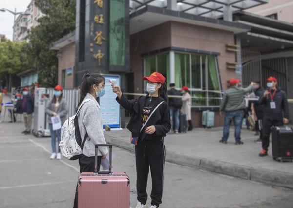 记者在旺苍中学校门口看到,在学校护卫队队员的指引下,该校学生正按照量体温、上交健康证明、填写承诺书、扫“健康码”等程序进入校园,之后再找各自班主任报到,并到指定地点进行第二次体温监测和登记。