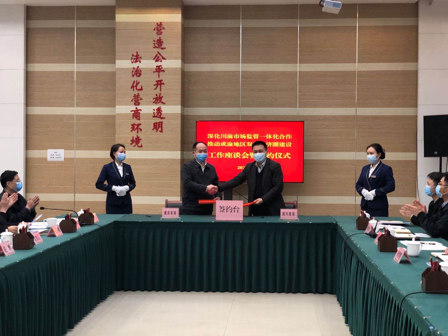 会上,两部门签署了川渝两地市场监管合作协议,《协议》从共创营商环境、共享信息资源、共建信用体系、联动监管执法、协同应急处置、共进毗邻地区、共筑人才交流等方面出发,确定了两地未来推进合作共建的方向和31个重点项目。
