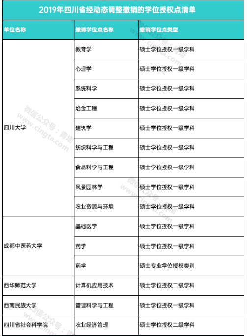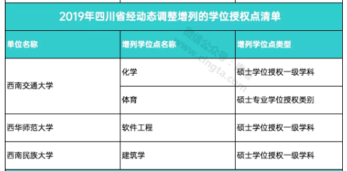 4月2日,国务院学位委员会正式公布了《关于下达2019年动态调整撤销和增列的学位授权点名单的通知》,各大高校或单位共新增231个学位点,撤销193个学位点。四川共新增4个硕士学位授权点,涉及3所高校。
