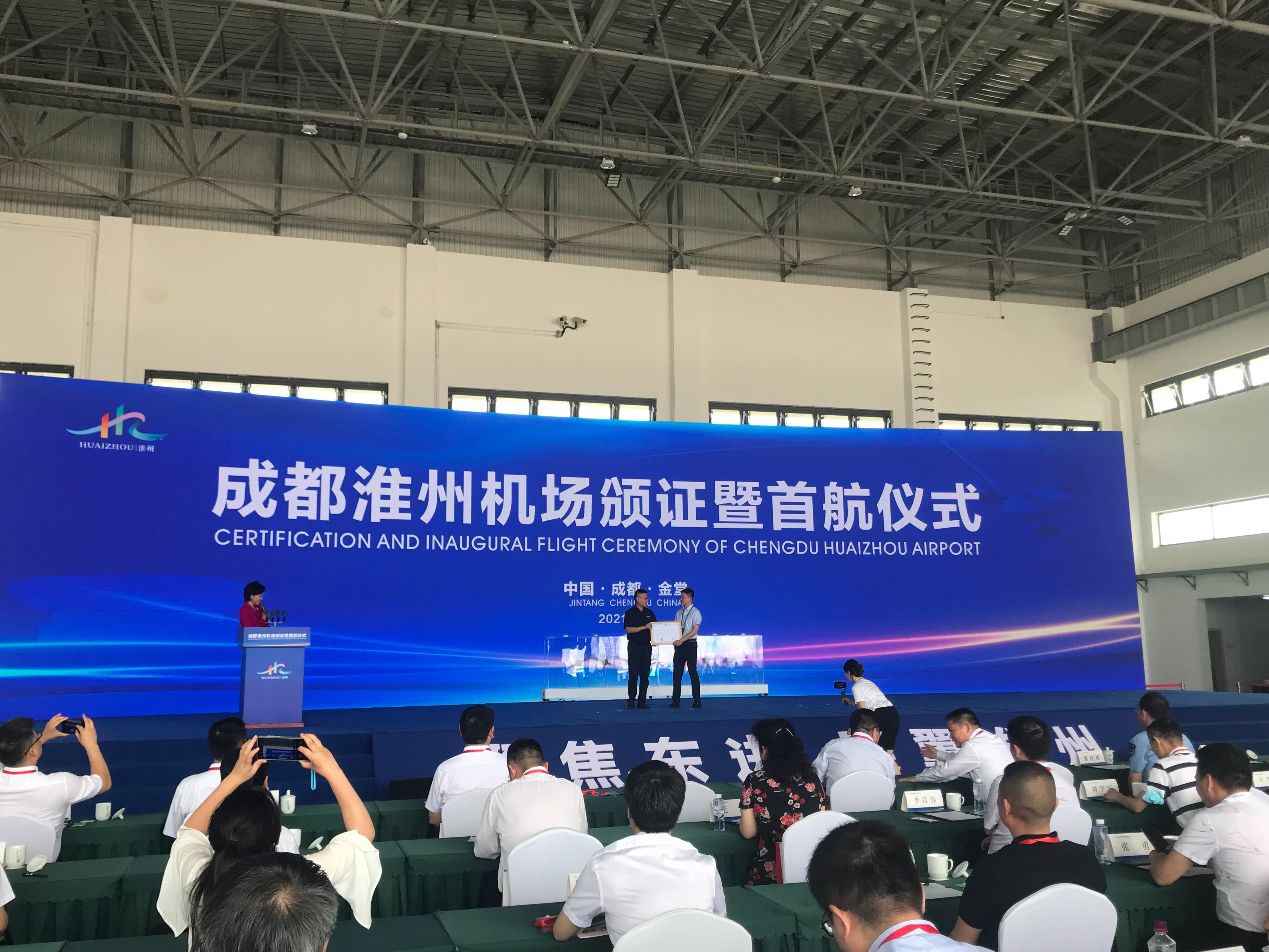 仪式上,中国民用航空四川安全监督管理局向成都通用机场运营管理有限责任公司颁发了通用机场使用许可证,外场飞机首次正式在成都淮州机场起飞,标志着成都淮州机场正式通航。