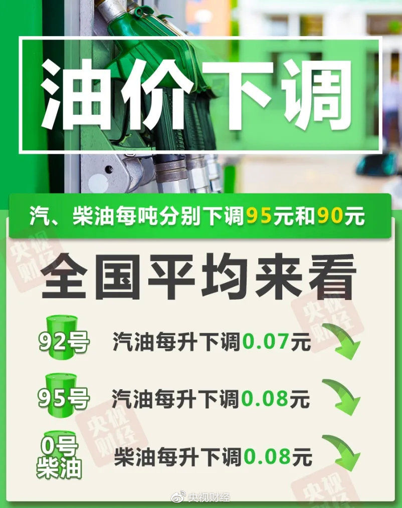 记者从国家发改委获悉,本次油价调整具体情况如下:汽油每吨下调95元,柴油每吨下调90元。