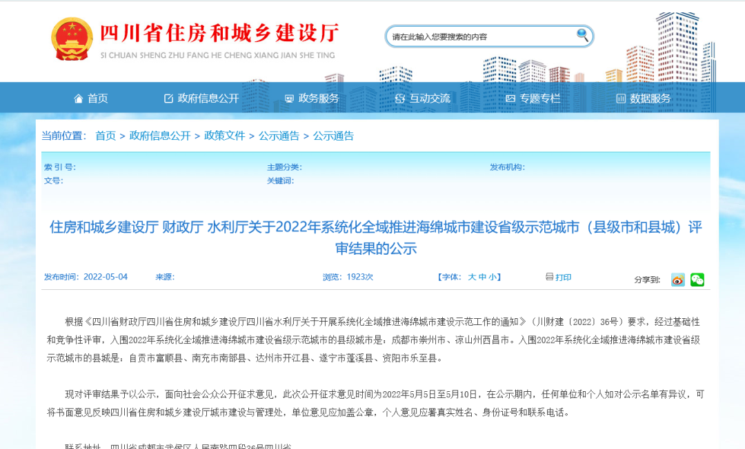 根据《四川省财政厅四川省住房和城乡建设厅四川省水利厅关于开展系统化全域推进海绵城市建设示范工作的通知》(川财建〔2022〕36号)要求,经过基础性和竞争性评审,入围2022年系统化全域推进海绵城市建设省级示范城市的县级城市是:成都市崇州市、凉山州西昌市。入围2022年系统化全域推进海绵城市建设省级示范城市的县城是:自贡市富顺县、南充市南部县、达州市开江县、遂宁市蓬溪县、资阳市乐至县。