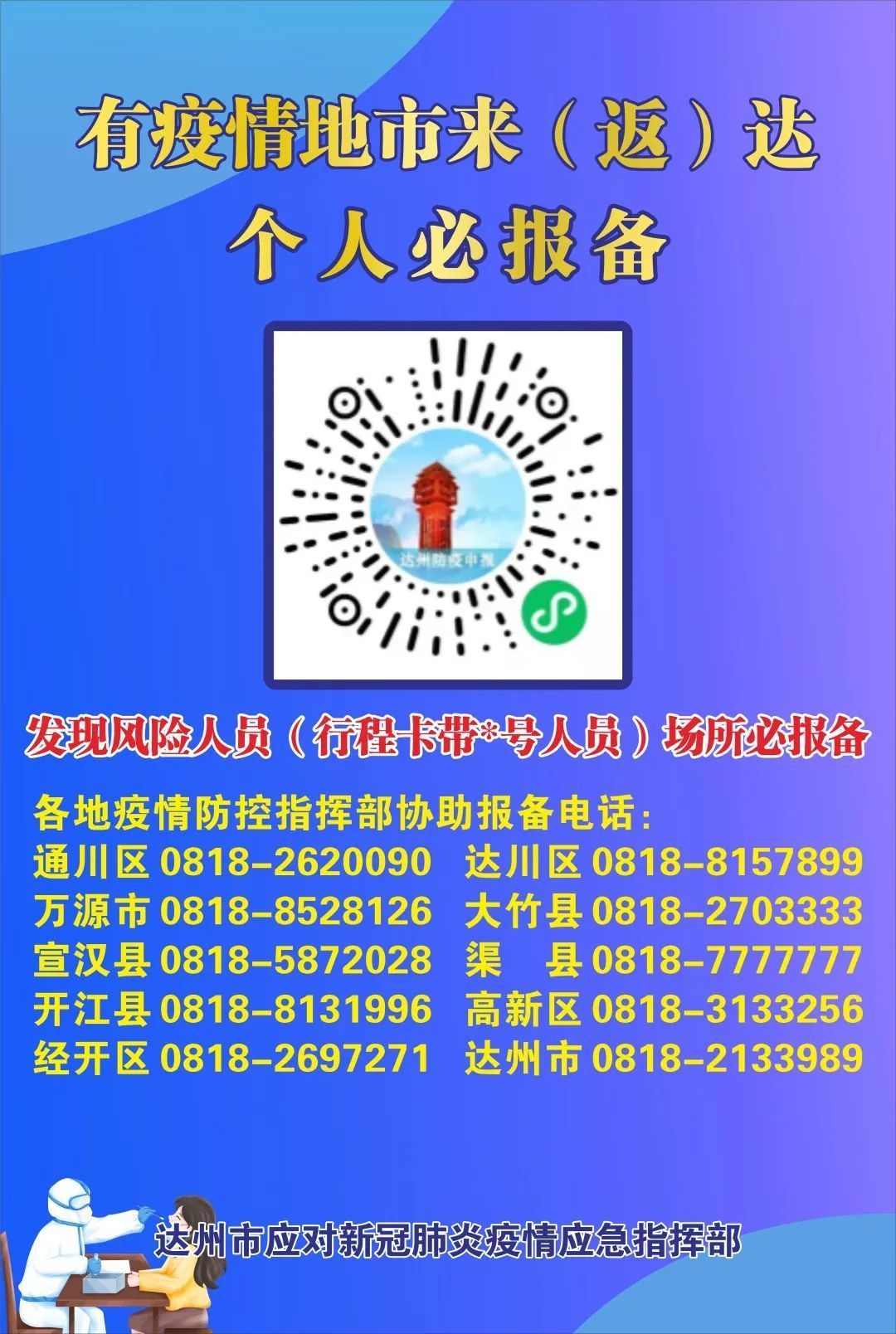 请来(返)达人员第一时间主动向所在社区(村)、住宿宾馆和单位报备,并配合当地疫情防控指挥部做好随访登记、核酸检测、医学观察或健康监测等疫情防控措施。保持警惕,做好防护,戴好口罩,勤洗手、不扎堆、少聚集,若有发热、咳嗽等不适症状,请及时就近前往发热门诊、哨点诊室、新冠病毒核酸检测机构就诊检查。