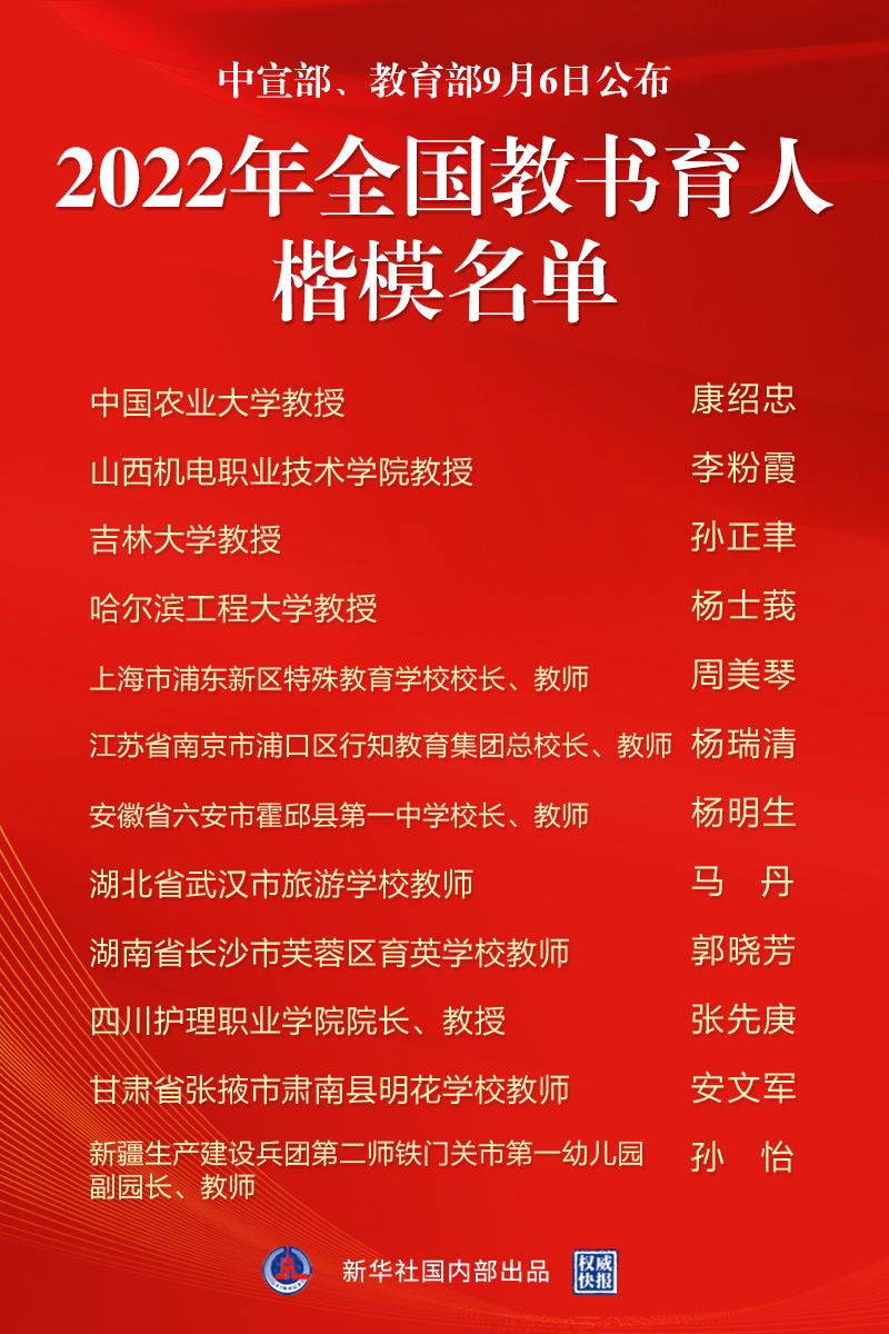 中宣部、教育部9月6日公布2022年全国教书育人楷模名单
