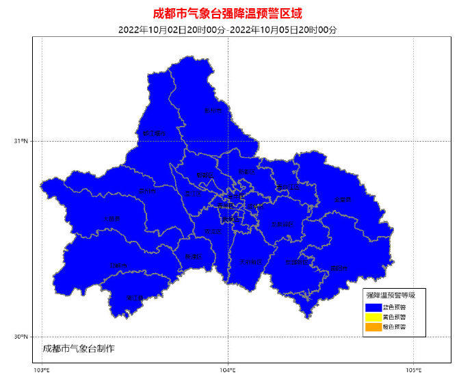 据@成都气象,成都市气象台2022年10月2日16时发布强降温蓝色预警: