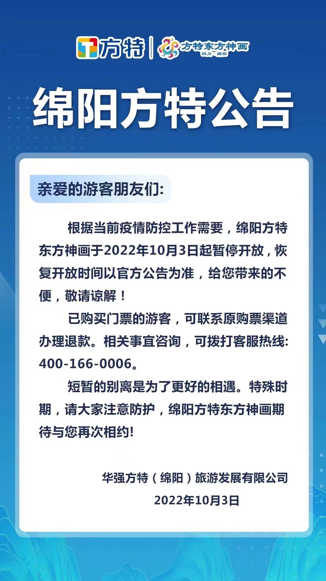 绵阳方特东方神画于2022年10月3日起暂停开放,恢复开放时间以官方公告为准,已购买门票的游客,可联系原购票渠道办理退款。相关事宜咨询,可拨打客服热线:400-166-0006。
