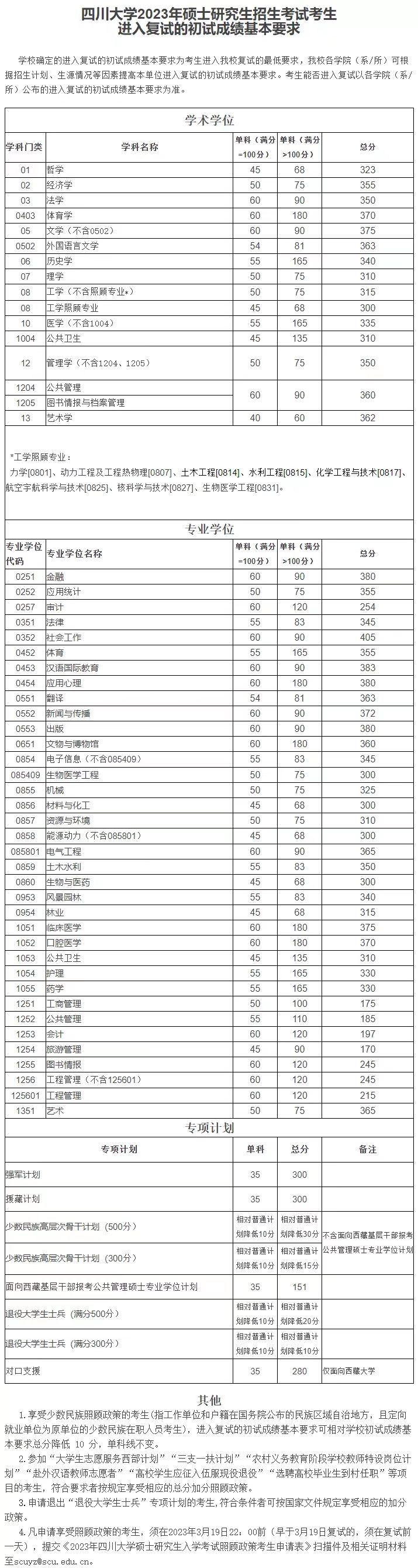 3月13日下午,四川大学公布了2023年硕士研究生招生考试考生进入复试的初试成绩基本要求。