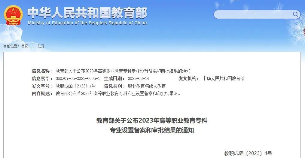 审批同意设置的国控专业将导入全国职业院校专业设置管理与公共信息服务平台,自2023年起可以招生。