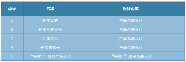 本命题围绕开江豆笋、开江巴粟香米、开江贡米、开江高钙米及“果林+”系列产品等5项具有代表性的农产品,开展品牌文化及产品包装设计。