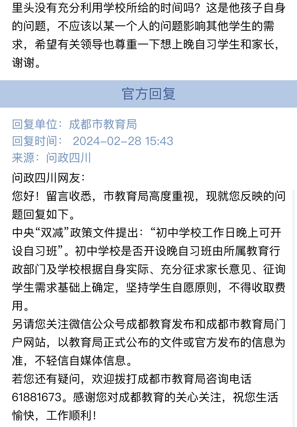 2月28日,成都市教育局在问政平台答复网友时表示,中央“双减”政策文件提出:“初中学校工作日晚上可开设自习班”。