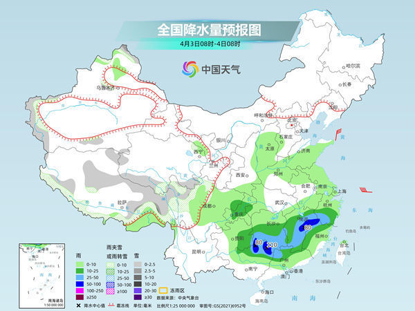 后天,新疆北疆高海拔地区和南疆西部山区、西藏北部、东部和西南部、青海南部、川西高原北部等地部分地区有小到中雪或雨夹雪。四川东部、重庆中部、贵州东部、浙江中南部、江西大部、湖南中南部、广西北部、广东北部等地部分地区有中到大雨,其中,湖南南部、江西中北部、福建西北部、广西东北部等地部分地区有暴雨,局地大暴雨(100~110毫米)。