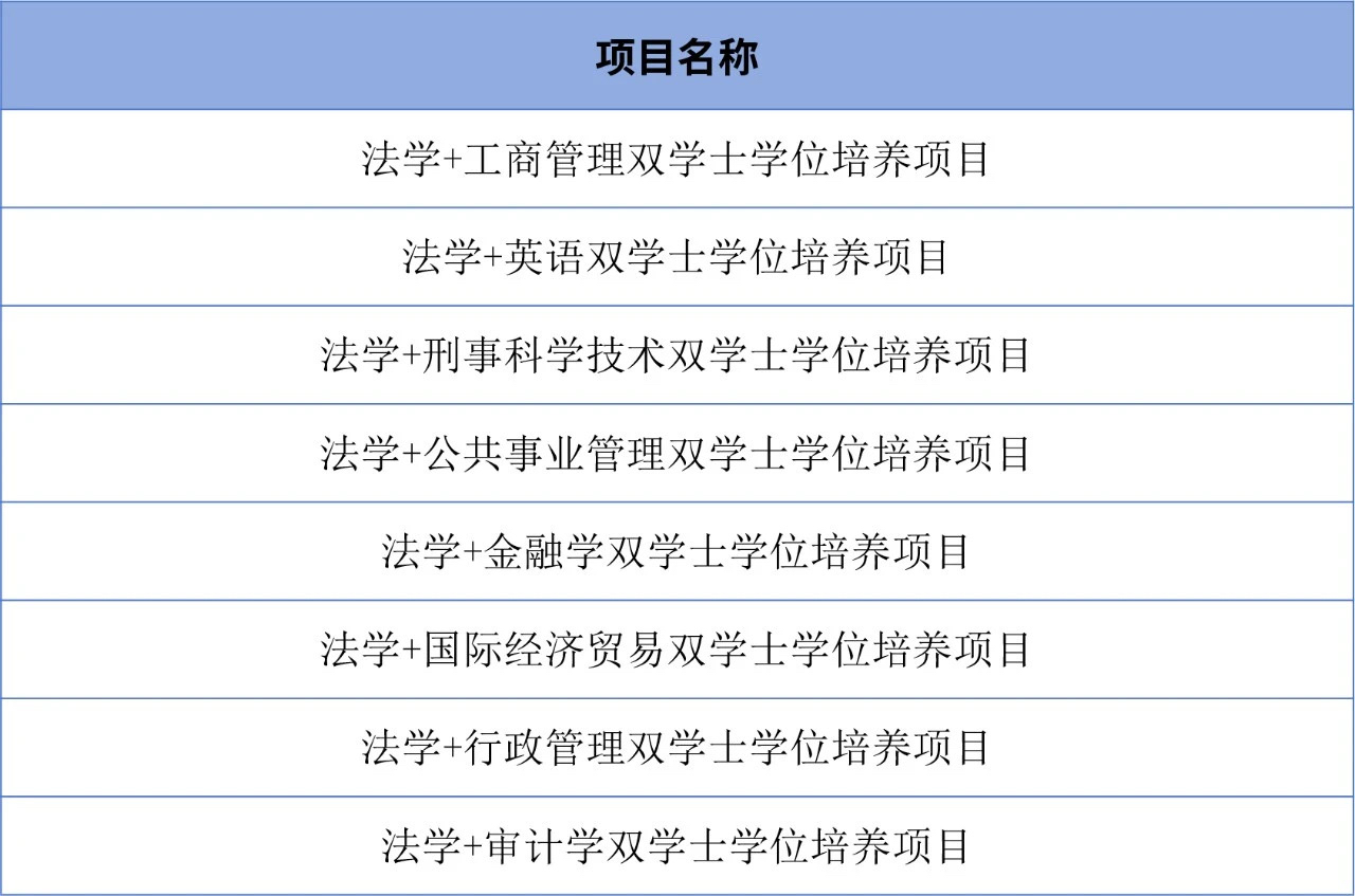 学校为进一步培养应用型复合人才,推出了“法学+”双学士学位复合型人才培养项目,共含有8个项目,学生在完成人才培养方案要求的学分并达到学士学位要求的,可授予法学专业学历,双学士学位。