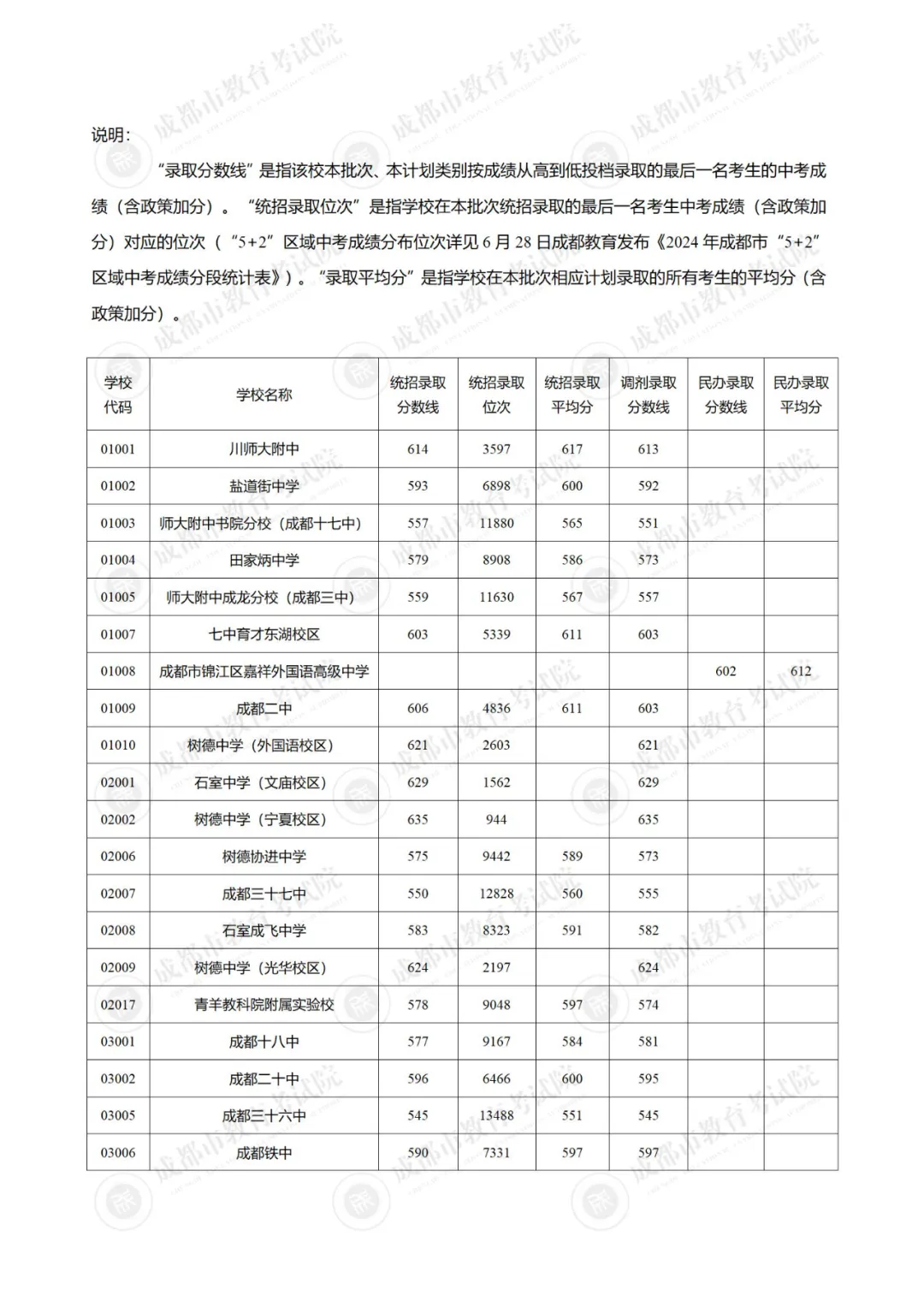 “统招录取位次”是指学校在本批次统招录取的最后一名考生中考成绩对应的位次(“5+2”区域中考成绩分布位次详见6月28日成都教育发布《2024年成都市“5+2”区域中考成绩分段统计表》)。