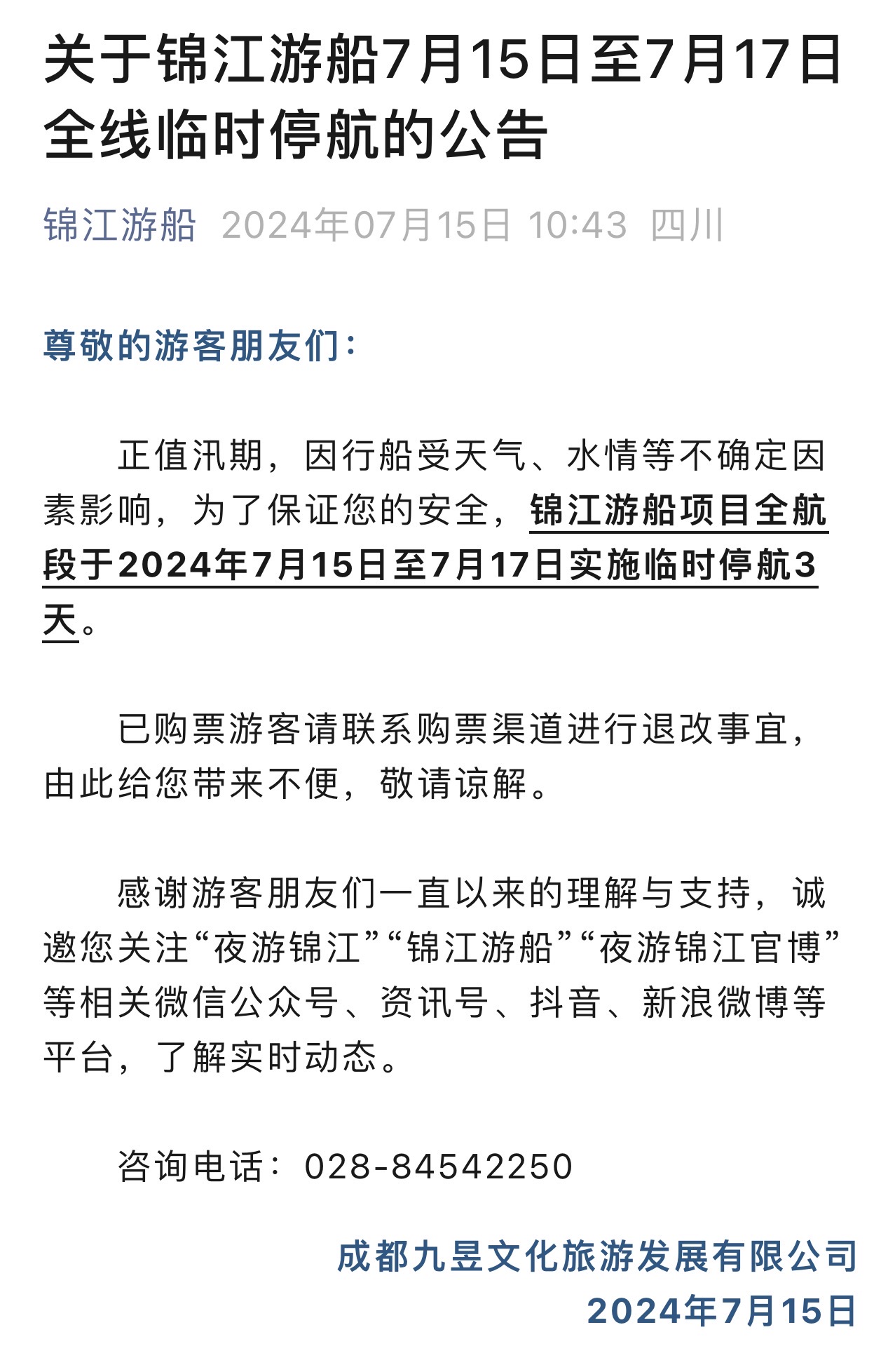 正值汛期,因行船受天气、水情等不确定因素影响,为了保证您的安全,锦江游船项目全航段于2024年7月15日至7月17日实施临时停航3天。