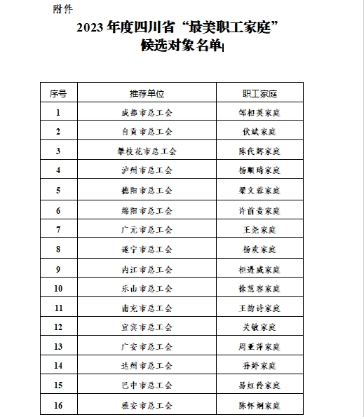 7月30日,四川省总工会网站公示2023年度四川省“最美职工家庭”候选对象名单,共40户家庭上榜,其中,由资阳市总工会推荐的张凡钊家庭入选。公示期为5个工作日(2024年7月30日至8月5日)。