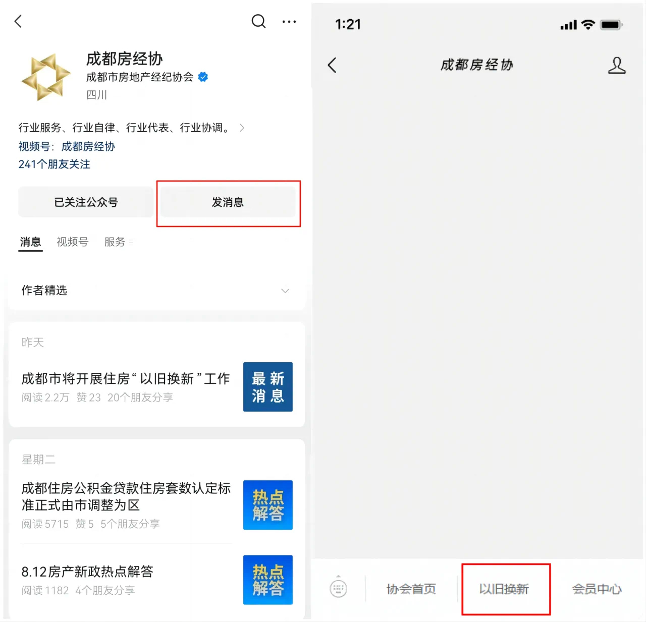 关注“成都房经协”微信公众号,进入“以旧换新”活动专区,具体操作流程如下。