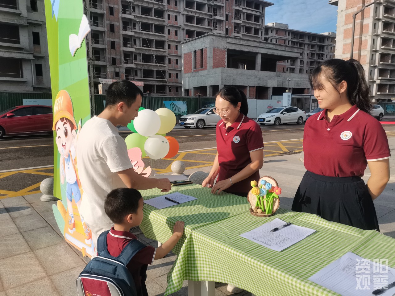 鲜花、气球、彩门将幼儿园门口装饰得充满童趣。早上八点,家长带着孩子们陆续前来报到,老师们早早地等在大门口,用温暖的怀抱和鼓励的话语迎接新同学的到来。