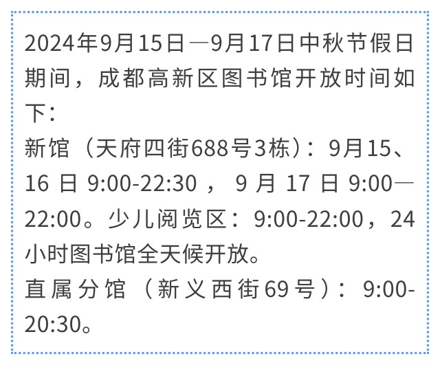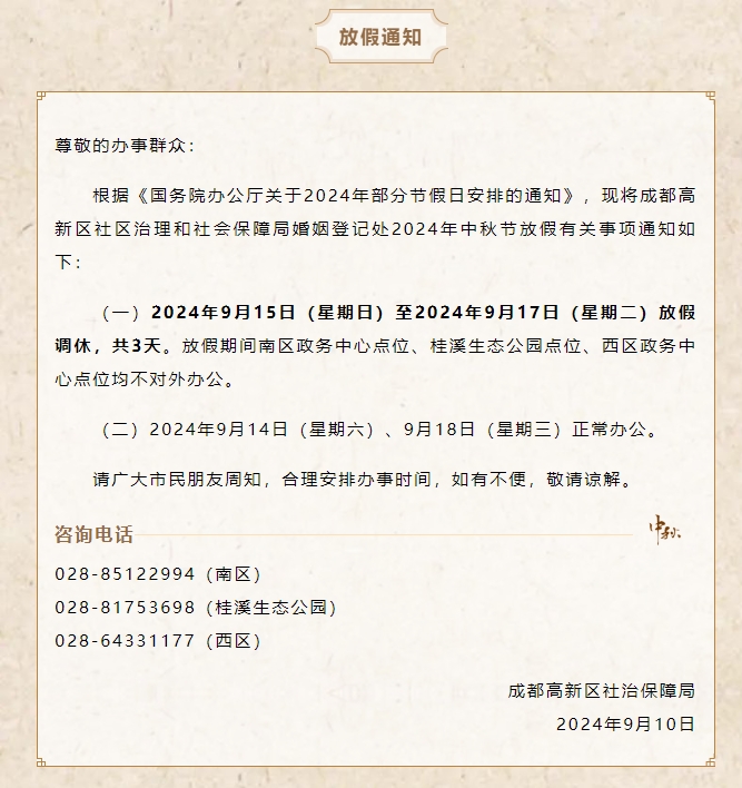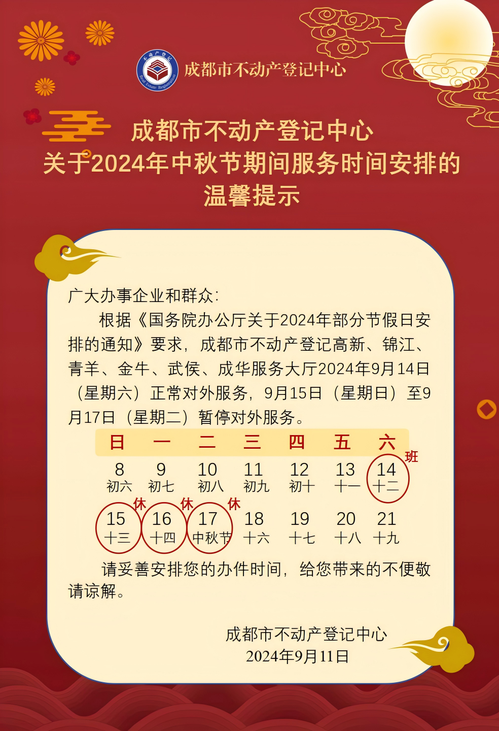 根据国务院办公厅通知精神,成都住房公积金管理中心将于2024年9月15日(周日)至9月17日(周二)中秋节放假3天。
