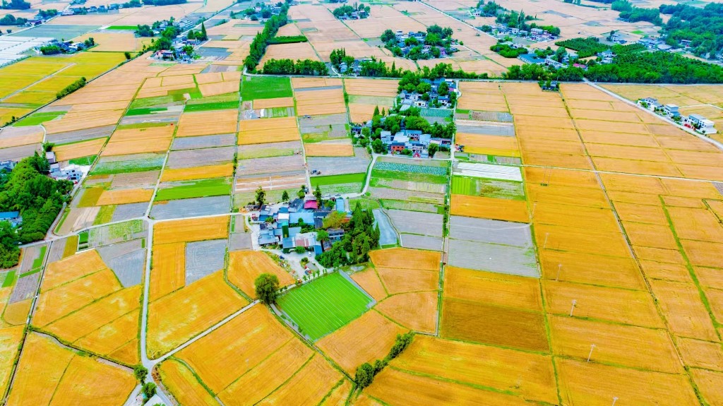 站在田埂上远望,金色的稻田被分割成方方块块,田埂宽阔平整,灌溉渠绕田而过,在青山绿树映衬间,与周边的民居村舍共同构成一幅绚烂的田园画卷。