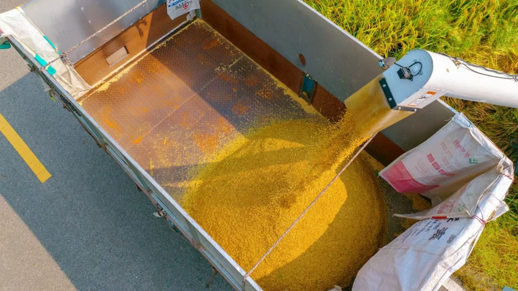 今日,军屯镇天府粮仓精品区的水稻种植示范基地里,数台收割机齐出动,一茬茬水稻被卷入机械大口,收割、断穗、脱粒等工序一气呵成,空气中瞬间弥漫着稻草的清香和稻谷的香甜。路边等候的卡车随即迅速运往烘干房,不一会儿,成片的稻田便颗粒归仓。