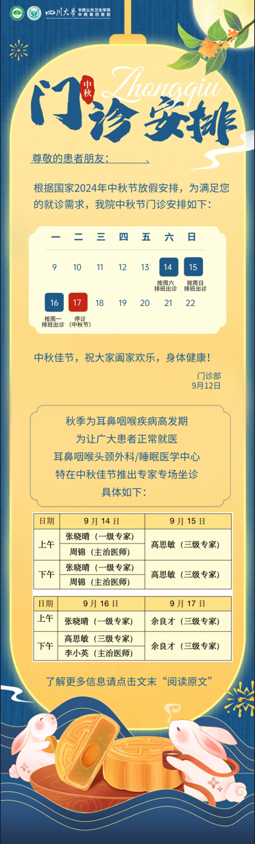 9月17日(星期二)为中秋节法定节假日,门诊停诊1天,急诊照常运行。9月14日(星期六)按照9月16日(星期一)的安排正常上班、行课,门诊不做调班(包括主院区和温江院区)。