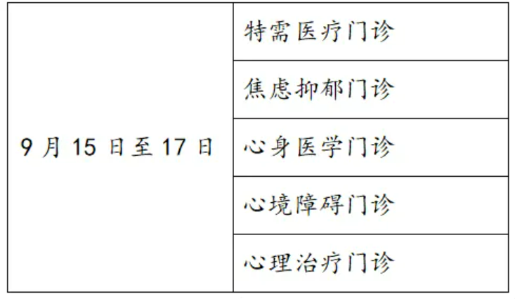 内科中心门诊:9月15日-17日全天开放;