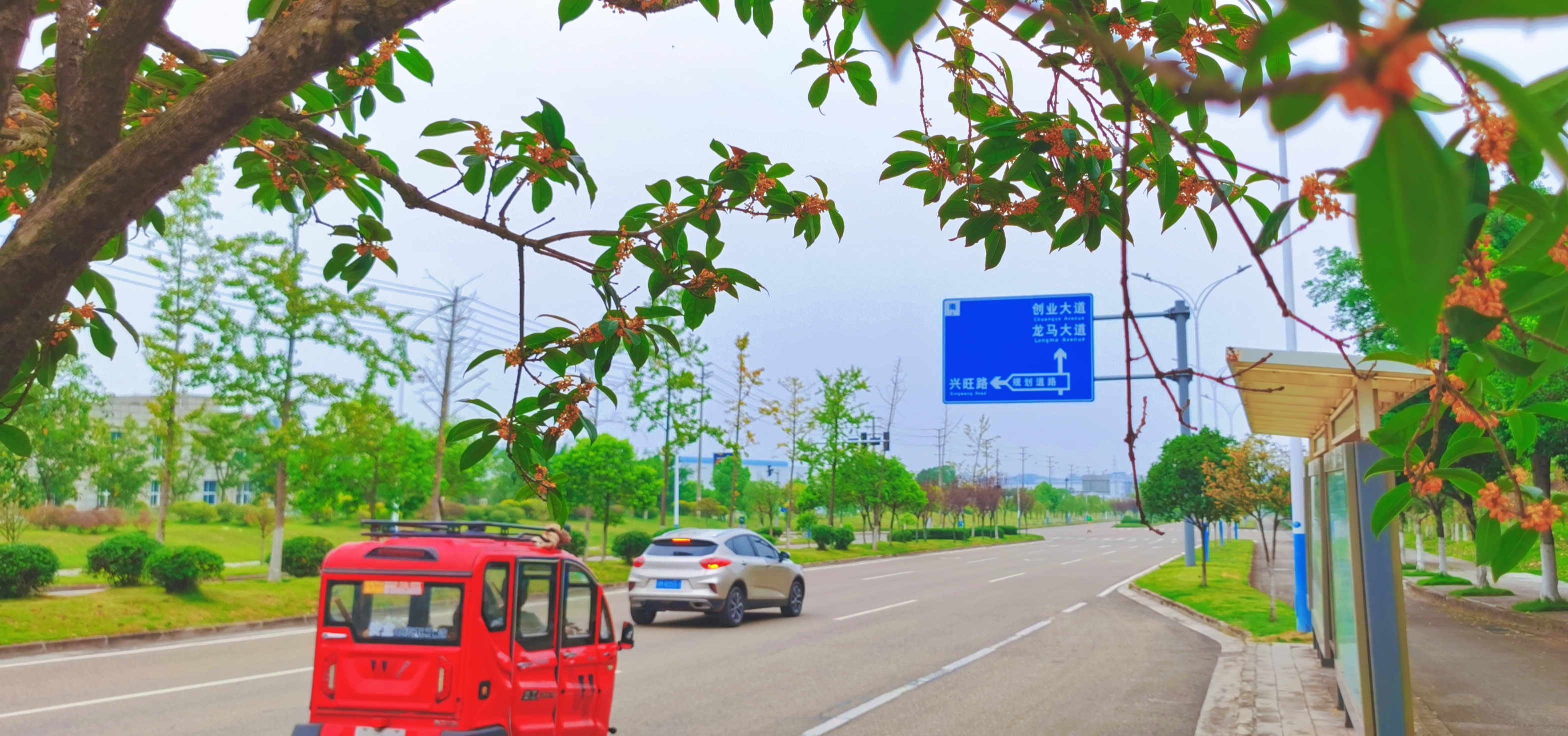 而沿着现代大道往创业大道方向前进,道路两侧的绿化带里更是一片生机盎然,含苞待放的桂花,仿佛在积蓄着力量,等待着最佳的绽放时机。