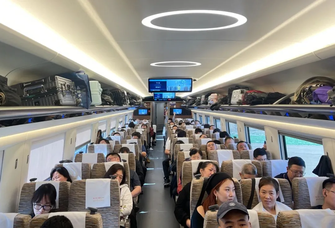 该趟车采用8辆标准编组重联运行,设有二等座席、一等座席和商务座座席,载客数为619人,最高运营时速350公里。