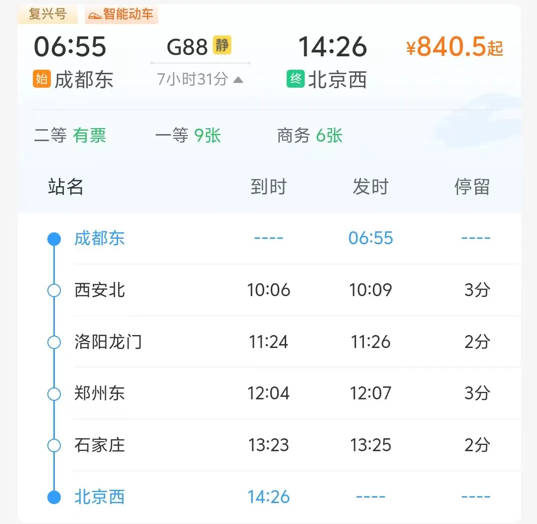 G88次列车全程运行7小时31分,由成都东站始发,途经西安北、洛阳龙门、郑州东、石家庄,终到北京西站。