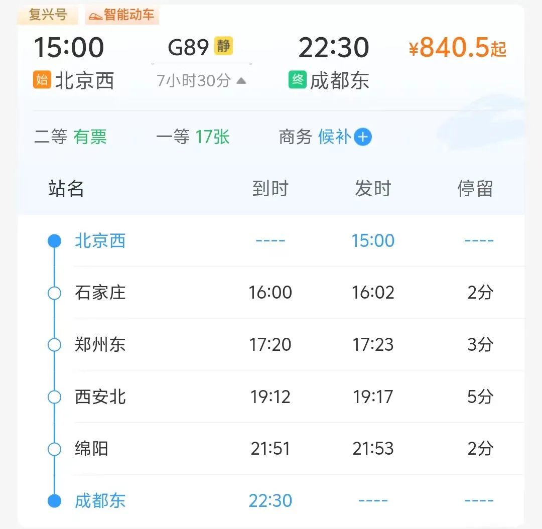G89次列车全程运行7小时30分,由北京西站始发,途经石家庄、郑州东、西安北、绵阳,终到成都东站。